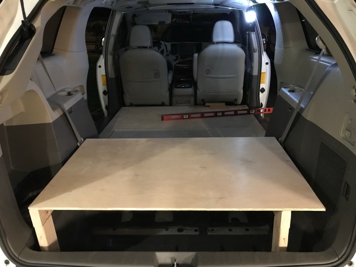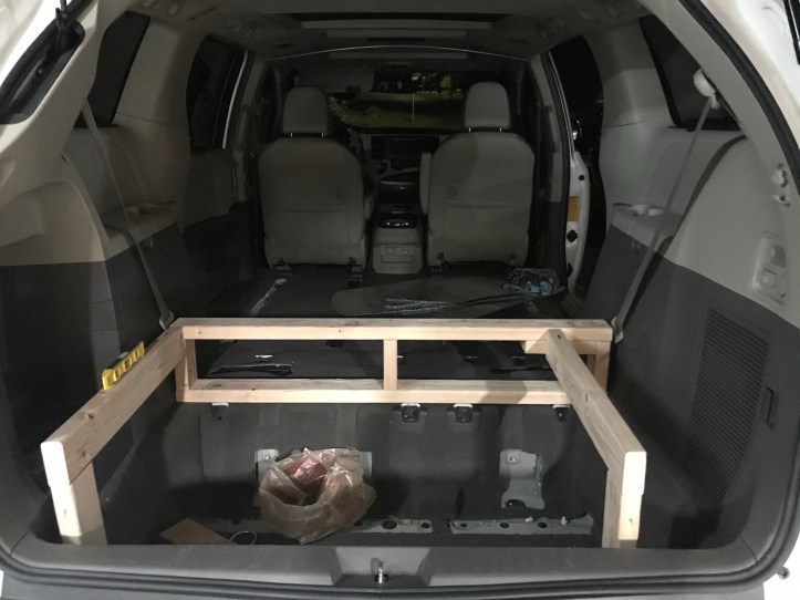 My kitchen will go in the rear of the van, so I can stand under the shelter of the liftgate to access it. My bed will extend over the “lid” of the kitchen so my bed will sit at the rear of the van. This should leave room for a porta potty at the front, and some floor space. So I built two arms to form the outline of my food storage well.