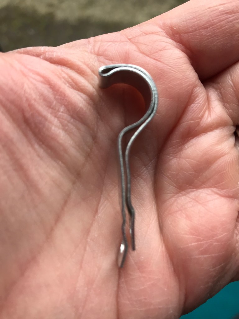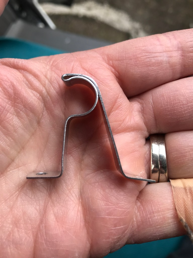 Then I can tuck the flat extended part into the gap between the plastic molding and the ceiling liner, leaving the curved rod holder exposed.