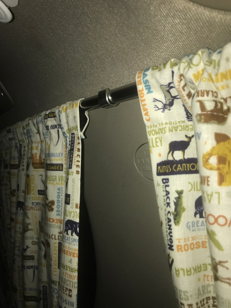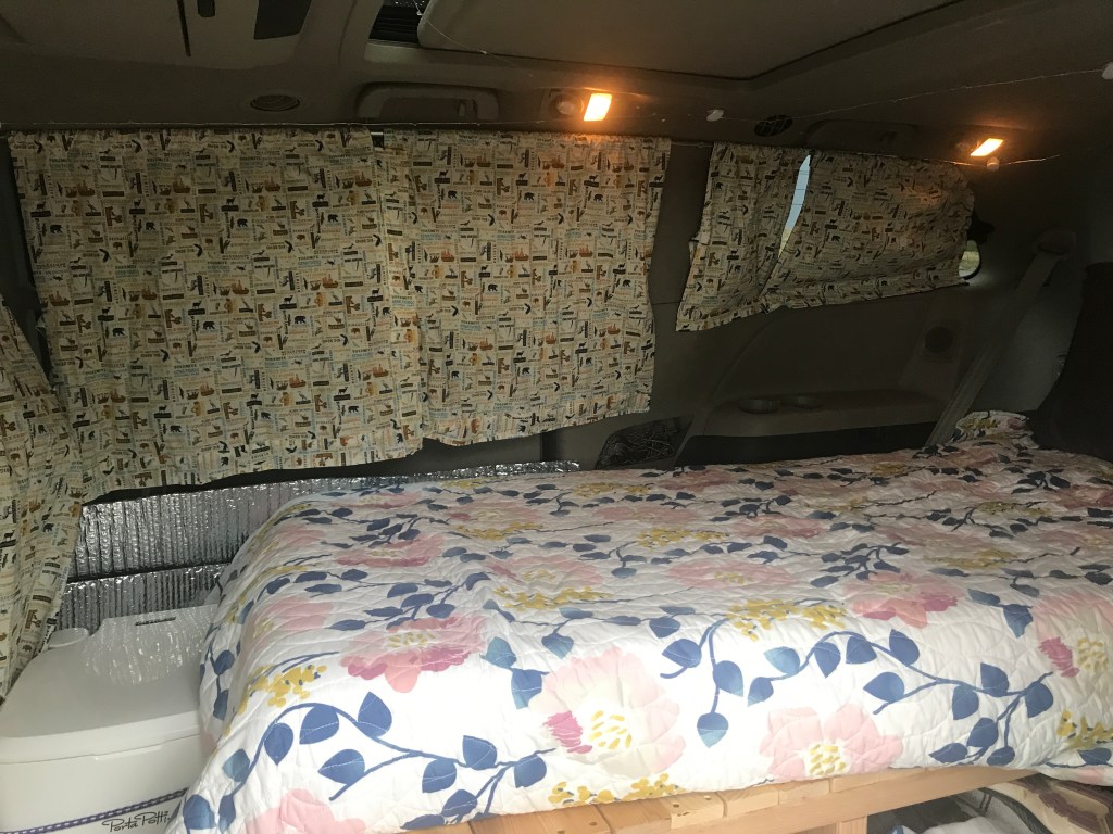 I was most stumped for the rear windows. I didn’t want to put holes in the plastic molding to mount hardware. I made curtains in two panels that have magnets sewn into the corners, and attached washers to the rear door around the window. The curtains snap right into place on the magnets and hold fast, and during the day I can wad them up and stick them in a storage cubby beside the bed.