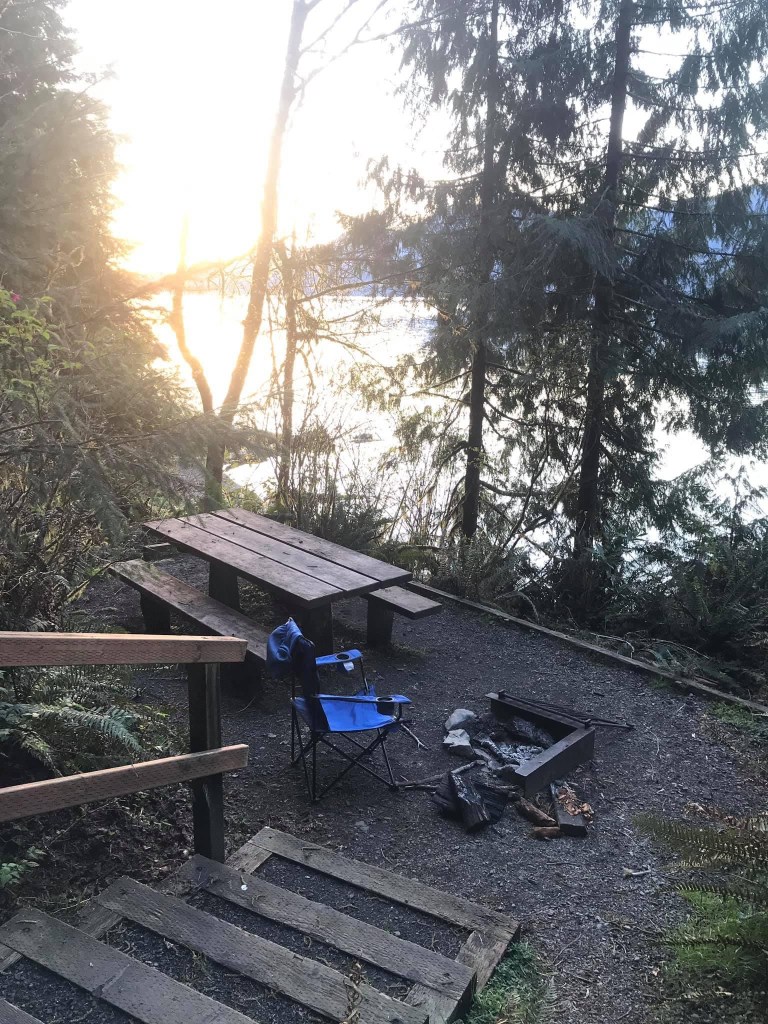 It’s an old style NF campground with car camping sites, no room for big rigs. And flush toilets! Water! SOAP! There were only a few campers. Sites overlooked the lake on a little bluff and were set down from the parking spot by steps.