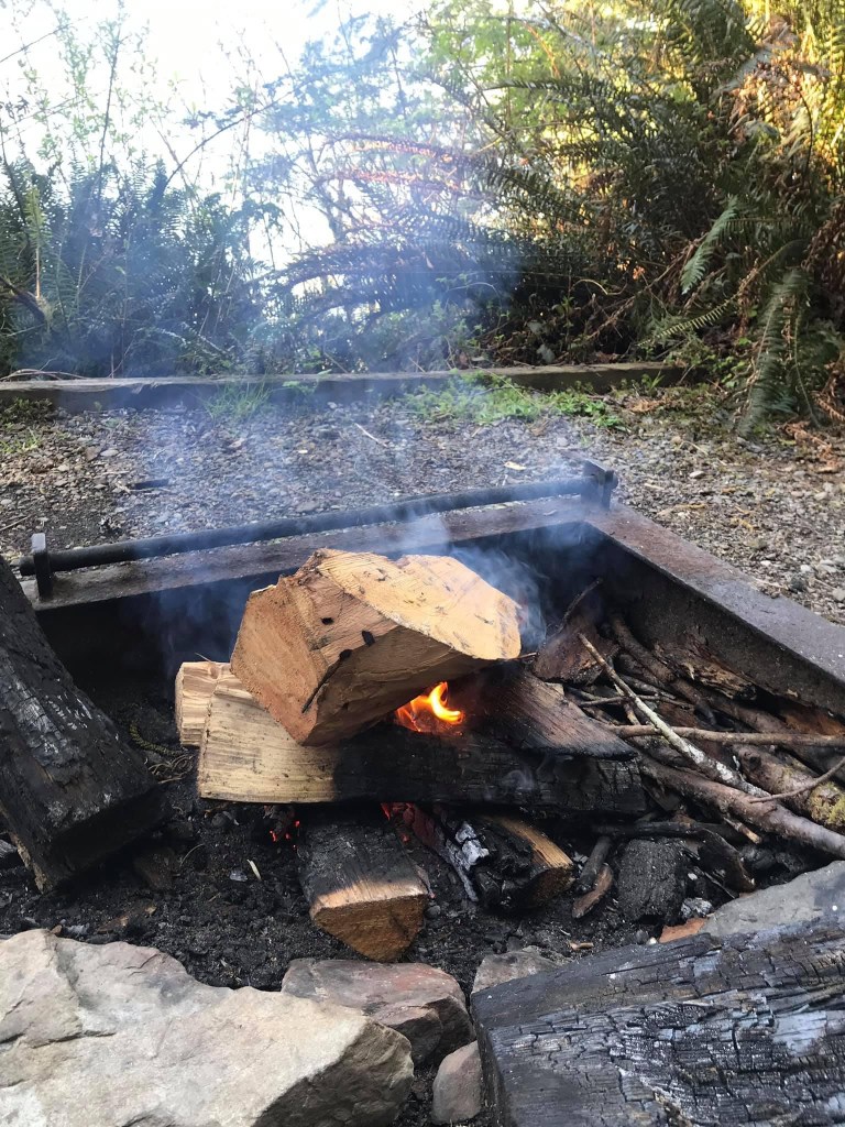 I had time for a little hike on a Rainforest Trail and spent most of the evening fanning my effort at a fire with my map atlas. Damp wood does not want to burn but it kept the chill off and I toasted a marshmallow!