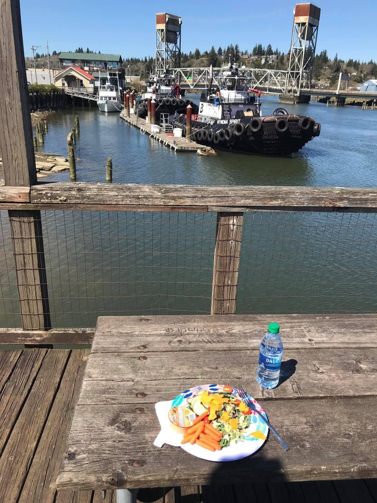 I stopped for lunch in Hoquiam and ate my kale salad and hummus (still sadly missing that rotisserie chicken) on a public dock jutting over the river.