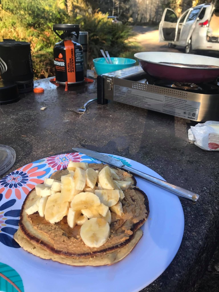 Adventure day 3. It was a chilly night and I haven’t mastered sleeping. It’s so annoying; my days would be so much better with good sleep. I decided on a hearty breakfast and pulled out the skillet for a peanut butter and banana pancake. OMG yum.