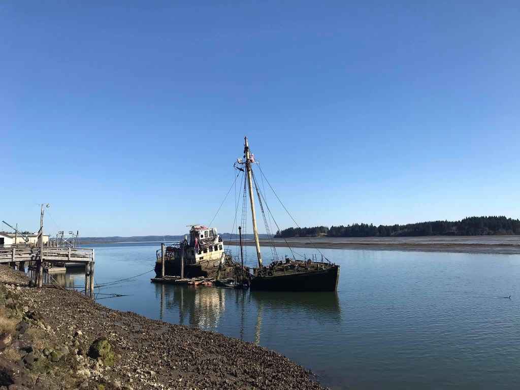 After cutting inland through timber forests 101 follows Willapa Bay. Every body of water no matter how small is dotted with rotted piling from some past structure. I wonder what all these piered buildings were?