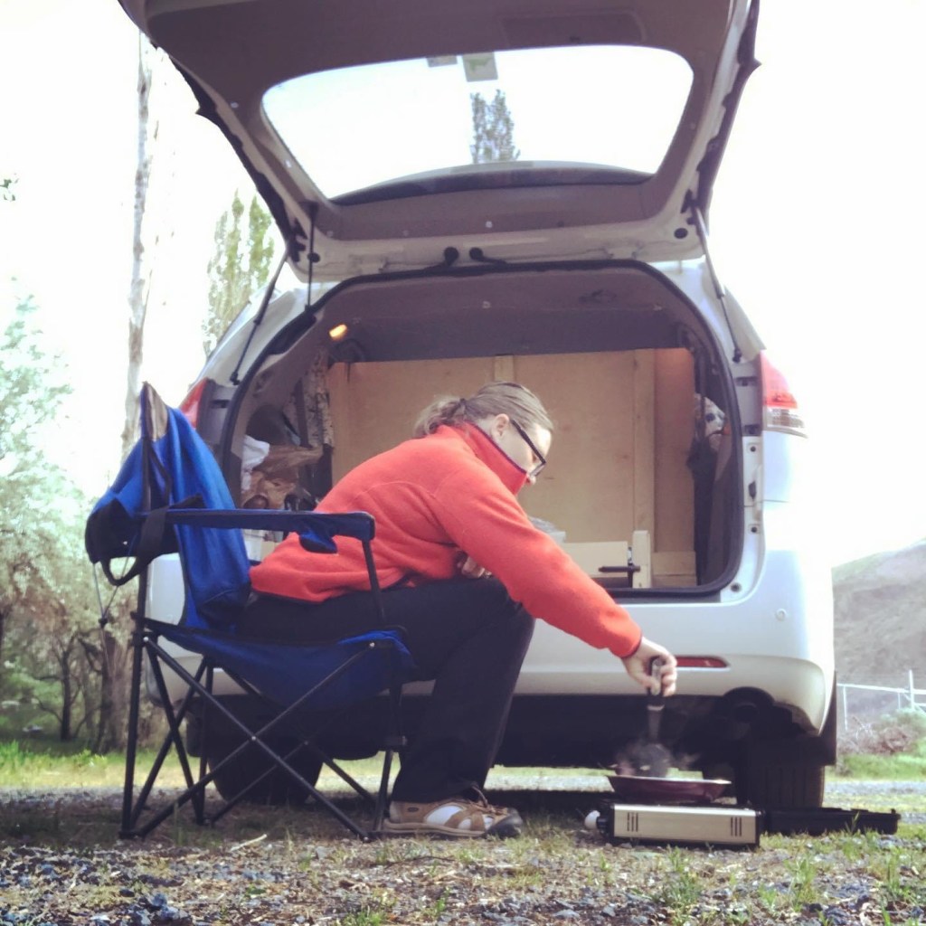 I’m camped on the Brownlee Reservoir, a DNR reservoir along the Snake River. The water level is well below the reach of the boat ramp so it’s deserted and peaceful here. But windy! I’m making breakfast of campsite chilaquiles on the leeward side of my minivan.