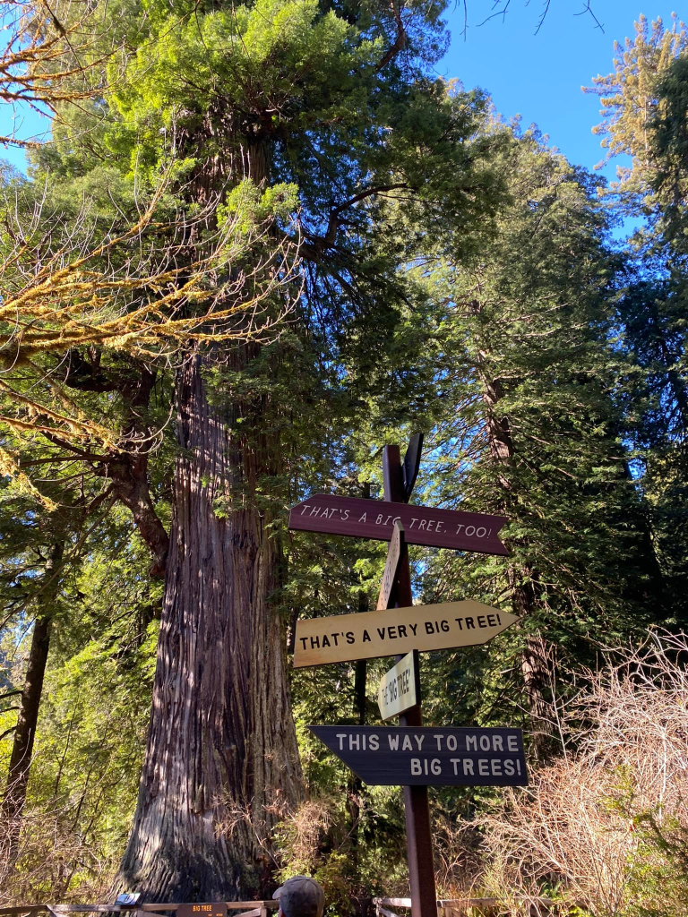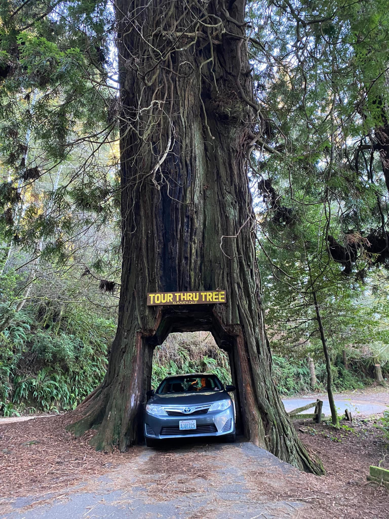 This morning we decided to go all in on redwoods. Bob has an old photo of his parents driving through a carved out tree, so when he saw that there is a huge redwood in nearby Klamath that you can drive through that was his number one stop. We did indeed eek through with his Camry, didn’t even have to tuck in the windows.