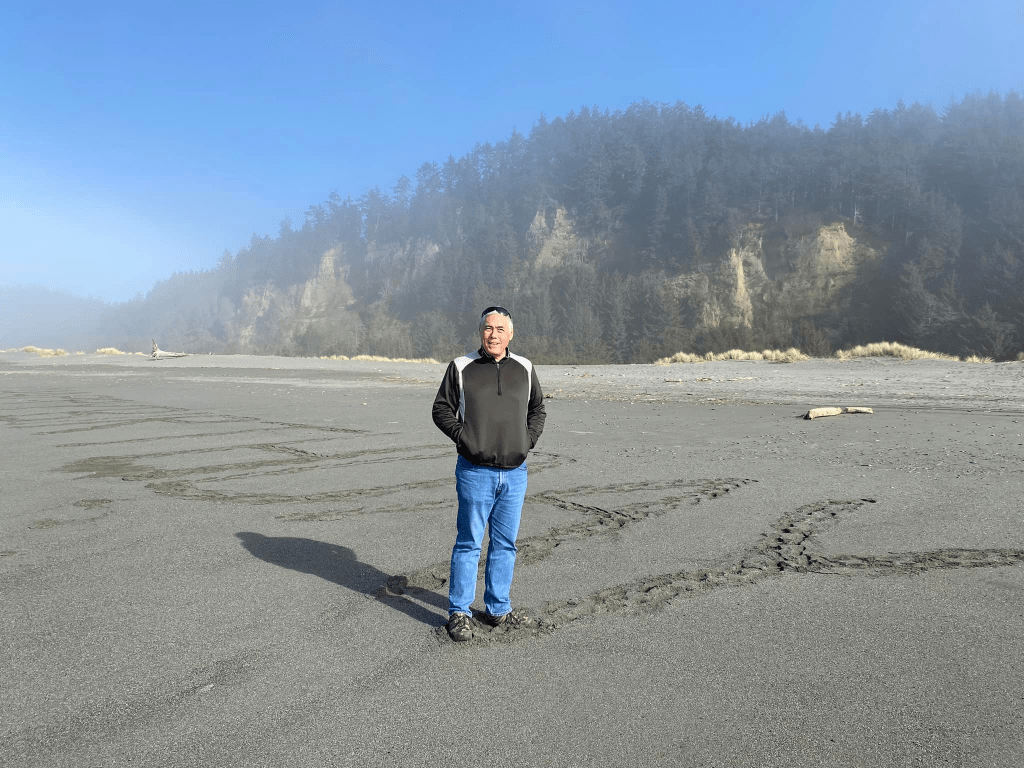 The beach was broad and foggy and empty of humans. Bob shuffled a “happy birthday” to me in the wet sand, soon to wash away in the incoming tide.